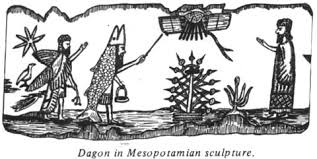 Pagan priests as half fish sprinkling holy water on Assyrian temple laver in the Pergamum Museum of Berlin. One of the names of this god in Babylon and Phylistia was Dagon (dag=fish, on=sun).